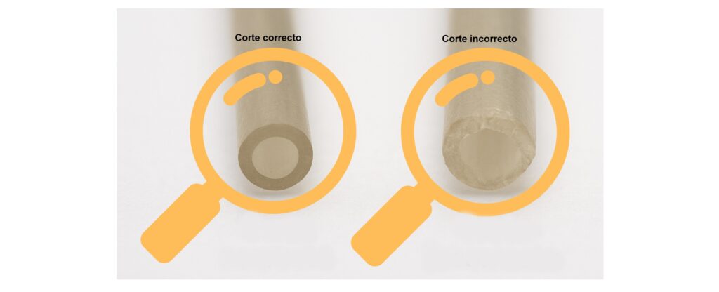 Luego, se debe revisar el corte bajo la lupa (recomiendo de 20X), el extremo debe verse como un horizonte claro. Cualquier irregularidad —por mínima que parezca— puede desatar fugas y flujos erráticos. Por eso, según los fabricantes se debe procurar hacer un «corte limpio, recto y sin rebabas». En el siguiente grafico muestro una comparación de dos cortes en una columna cromatográfica.