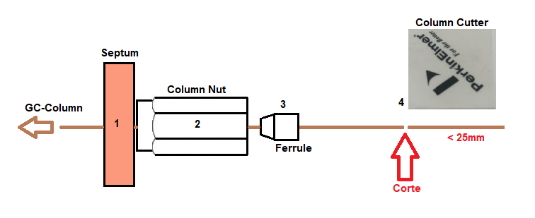 Aquí la precisión es arte. Usa un cortador de cerámica o diamante. Antes de realizar el corte de la columna primero colocar la tuerca de la columna y la férula. Opcionalmente también puedes colocar un septo antes de la tuerca para facilitar la instalación en el GC; así como se muestra en el siguiente grafico.