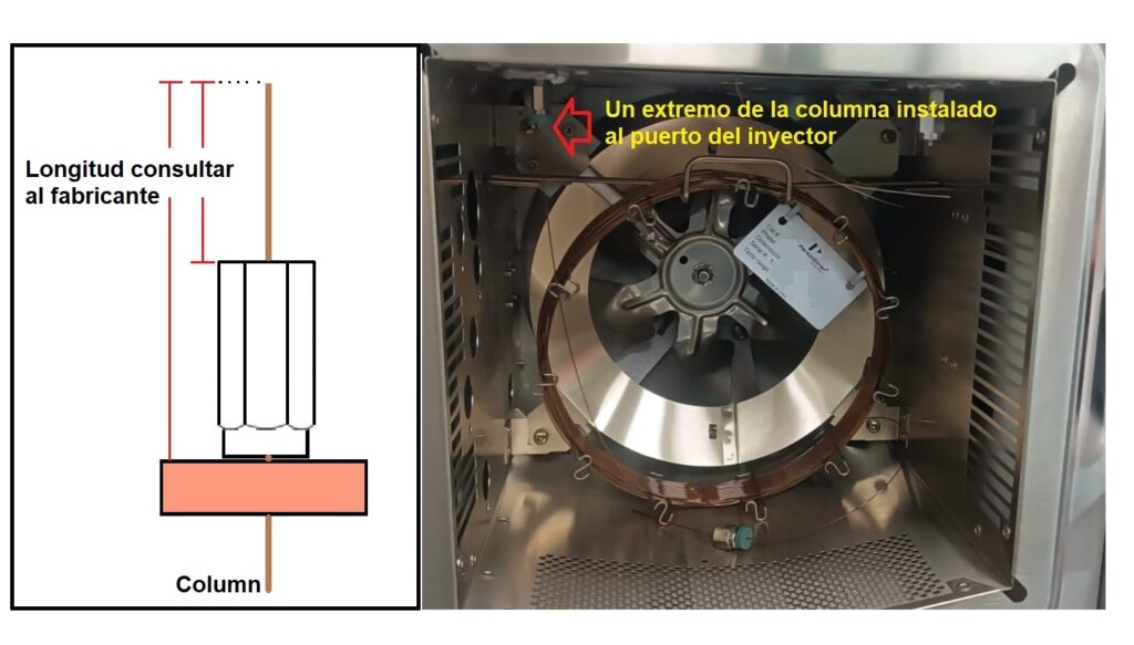 Montar la columna en el colgador de la columna y luego insertar la columna en el puerto con suavidad (Las medidas varían según los fabricantes y el tipo de inyector). Más allá de eso, el calor puede sobrecalentar la fase estacionaria antes de que empiece el análisis.